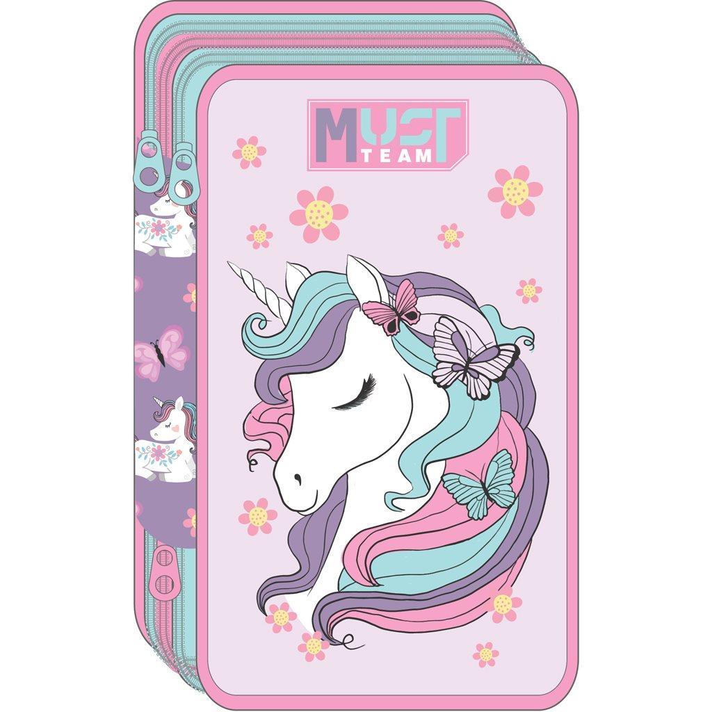 - Triple Decker School Pencil Case Filled Must Team Unicorn contains pen, pencil, eraser, eraser, rulers, crayons and markers