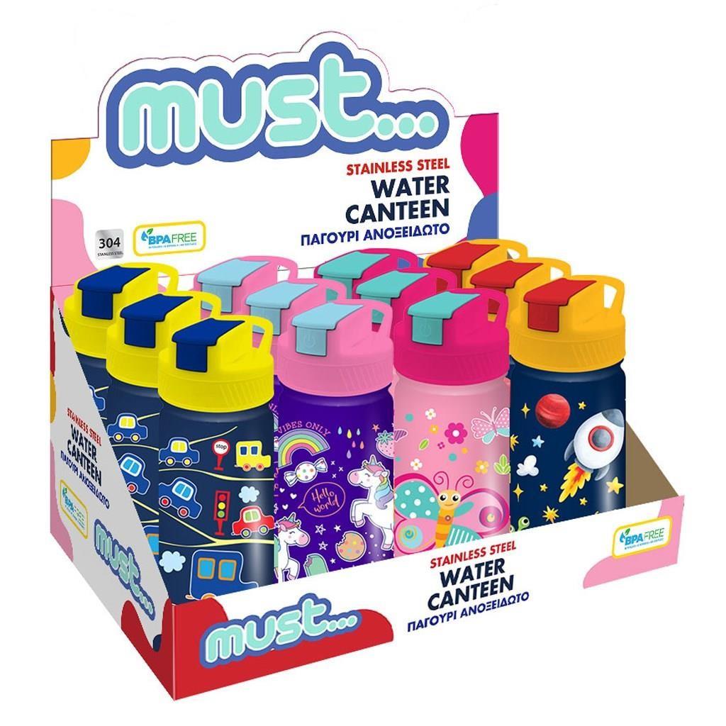 Water Canteen Must 450ml Stainless Steel 7.5x17 4 Designs is available in 4 designs (Little Cars, Unicorn, Butterfly, Space) and is an ideal accessory for the nursery, kindergarten and playground.