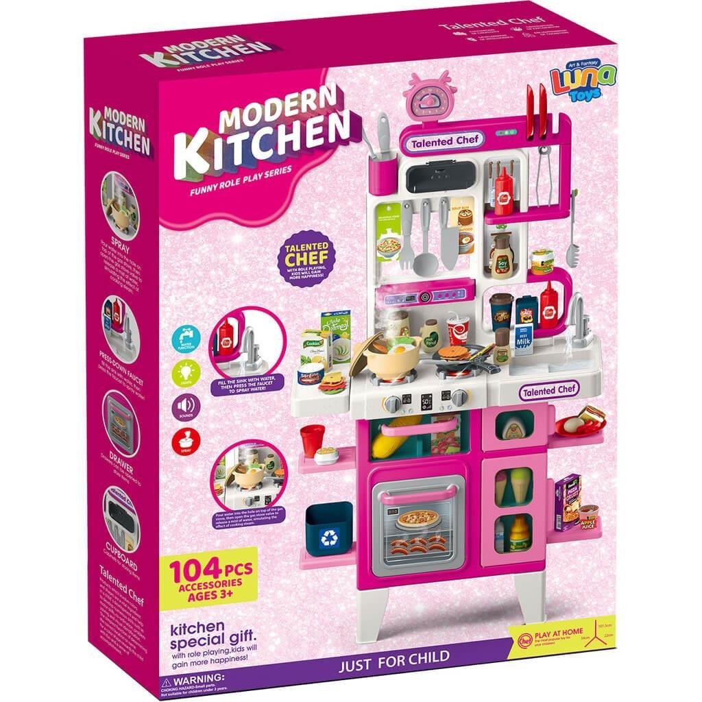 KITCHEN 101,5CM WITH LIGHT, SOUND AND WATER SPRAY PINK 104PCS 49X13X66CM LUNA