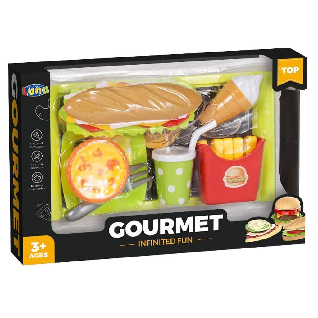 - Includes tray, sandwich, french fries, soft drink, ice cream, dessert and fork