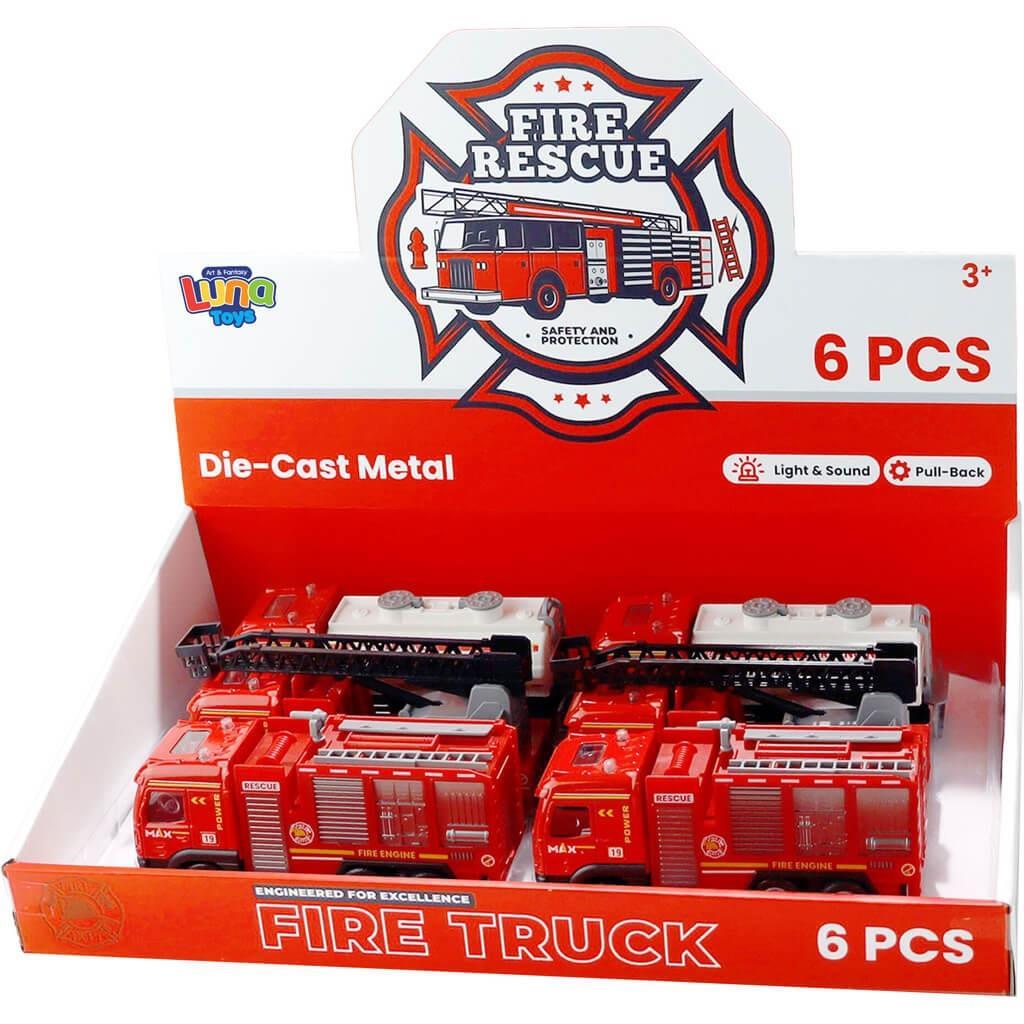 FIRE ENGINE TRUCKS 17X5,3X7,8CM PULL BACK WITH LIGHT AND SOUND 38,5X23,5X31CM LUNA